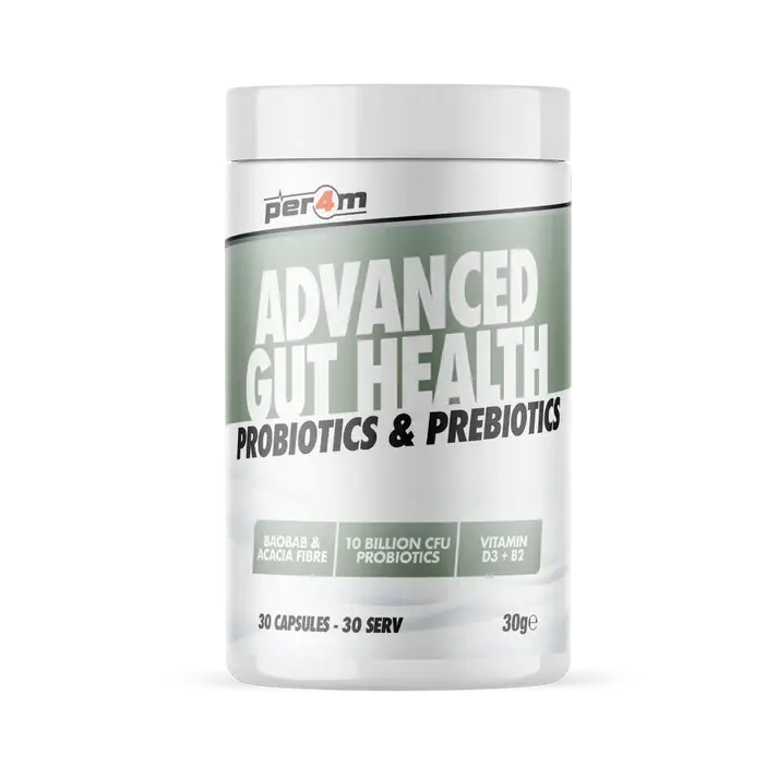 Gut Health is a daily capsule designed to support digestive balance, nutrient absorption, and overall wellbeing from the inside out.Formulated with a blend of key ingredients that contribute to a healthy gut environment, its ideal for anyone looking to optimise digestion, improve comfort, or support performance through better internal health. Each capsule includes probiotic strains, prebiotic fibres, and digestion-supporting compoundsthat work together to maintain a healthy gut microbiome. A balanced gut plays a vital role in energy levels, immune function, mood regulation, and nutrient uptake - making Gut Health an essential addition to any lifestyle or training routine. Easy to take, gentle on the stomach, and suitable for daily use, PER4M Gut Health helps keep your digestive system functioning smoothly so you can feel your best every day. Clean, effective, and performance-focused - PER4M Gut Health supports the foundation of better wellbeing.