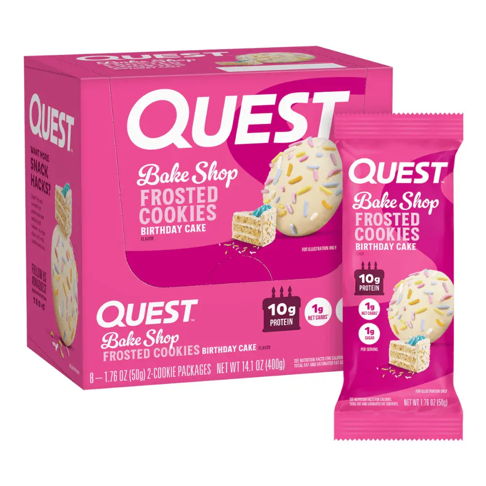 Container Size: 8x25g Serving Size: 1 cookie (50g) Amount Per Serving: Protein: 11g Carbohydrates: 18g Fat: 13g Salt: 0g Ingredients: MILK PROTEINS (WHEY PROTEIN ISOLATE, CALCIUM CASEINATE, SODIUM CASEINATE, MICELLAR CASEIN), VEGETABLE OIL (SUNFLOWER, CANOLA, AND/OR SOYBEAN OIL), ERYTHRITOL, WATER, COCOA PROCESSED WITH ALKALI, ALMONDS, GLYCERIN, POLYDEXTROSE, PALM KERNEL OIL, CELLULOSE. CONTAINS LESS THAN 2% OF THE FOLLOWING: NATURAL FLAVORS, SEA SALT, SOLUBLE CORN FIBER, LECITHIN (SUNFLOWER, CANOLA, AND/OR SOY LECITHIN), BEET ROOT POWDER (COLOR), ANNATTO EXTRACT (COLOR), TURMERIC EXTRACT (COLOR), GUM ARABIC, BAKING SODA, SUCRALOSE, XANTHAN GUM. Please Note: Nutritional facts and ingredients may vary slightly between flavours.