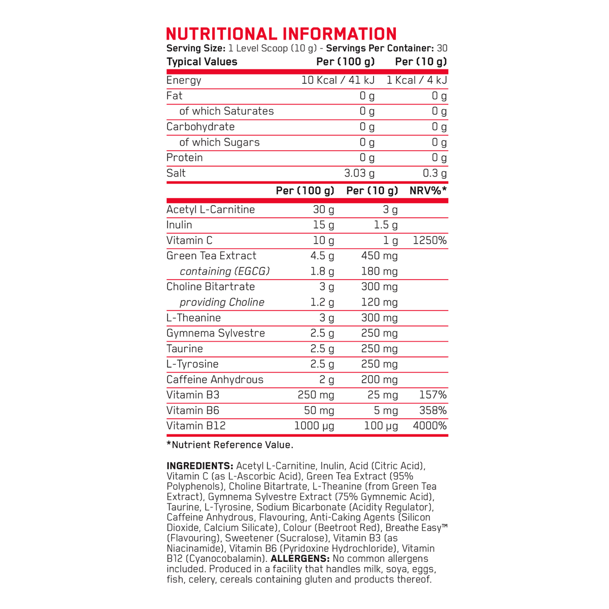 Container Size: 300g Serving Size: 1 scoop (10g) Amount Per Serving: Protein: Carbohydrates: Fat: Salt: Ingredients: Acetyl L-Carnitine, Betain Anhydrous, Citric Acid (Acidity Regulator), Vitamin C (Ascorbic Acid), Green Tea 95% Polyphenols, Choline Bitartrate, L-Theanine, Gymnema Sylvestre Leaf Extract (containing 75% Gymnemic Acids), Taurine, L-Tyrosine, Sodium Bicarbonate, Caffeine Anhydrous, Natural Flavour, Natural Colour, Anti-Clumping Agents: (Silicon Dioxide, Calcium Silicate), Breathe Easy? (Flavour), Pro GBB? (Gamma-Butyrobetaine Ethyl Ester HCL), Sucralose (Sweetener), Vitamin B3 (as Nicotinamide), Vitamin B6 (Pyridoxine Hydrochloride), Vitamin B12 (as Cyanocobalamin). Please Note: Nutritional facts and ingredients may vary slightly between flavours.