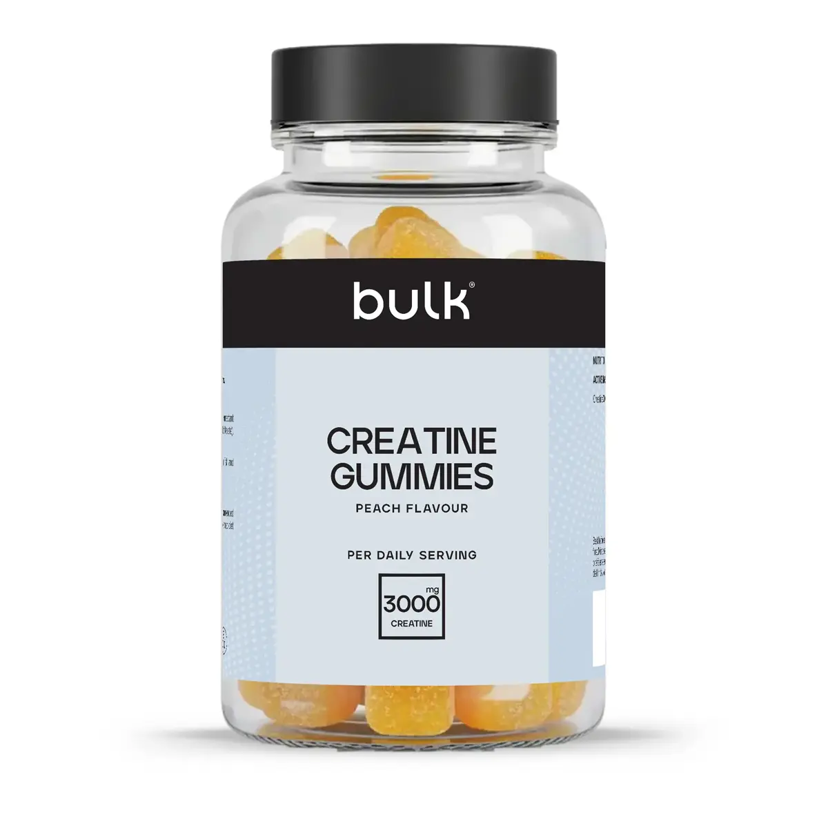 Creatine GummiesConvenient powerLevel up your training with Creatine Gummies. Easy-to-eat and packed with 1000mg creatine per gummy, theyre a simple addition to your daily routine. Take them daily and see what you can really do.Why should I take it?Hit reps harder. Boost your lifting power*. Smash your PBs. All with the convenience of a delicious gummy.These gummies are your ultimate workout partner.Why it worksBUILD STRENGTH and see what you can really doGET CONVENIENT POWER with gummies twice the strength of industry standard*Creatine increases physical performance in successive bursts of short-term, high-intensity exercise. The beneficial effect is obtained with a daily intake of 3g of creatine.The science behind the productCreatine is a naturally occurring compound found in small amounts in foods like meat and fish, and it is also produced by the body. In muscles, creatine helps create a quick source of energy that your body can use during short, intense bursts of activity like lifting or sprinting.Bulk Creatine Gummies deliver all the benefits of creatine in a convenient, ready-to-eat format. Each gummy contains 1000mg of creatine, making it easy to maintain consistent daily supplementation without mixing powders or shakes. The gummy format is ideal for on-the-go use, whether youre traveling, at work, or moving between gym sessions, and it allows precise dosing to ensure you hit your daily creatine targets.