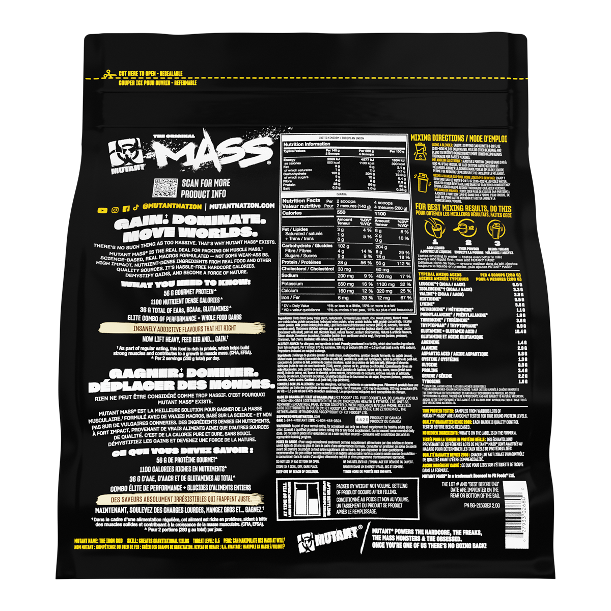 Container Size: 2.27kgServing Size: Per 4 Scoops (280g)Servings Per Container: 8;Container Size: 6.8kgServing Size: Per 4 Scoops (280g)Servings Per Container: 24;Container Size: 280g (single serve sample)Serving Size: Per 1 Packet (280g)Servings Per Container: 1;Total Calories: 1100Protein: 56gTotal Carbohydrates: 192g-Sugars: 18g-Dietary Fibre: 8gFat: 12g-Saturates: 6gSalt: 580mg;Ingredients: Carbo Blend (Waxy Maize Starch, Maltodextrin, Barley Starch, Sweet Potato, Rolled Oat), Mutant Mass Pro-Matrix (Milk) (Whey Protein Concentrate, Hydrolyzed Whey Protein, Whey Protein Isolate, Micellar Casein Protein, Milk Protein Concentrate, Milk Protein Isolate), Lipid Foods Blend (Fractionated Coconut [MCT] Oil, Avocado, Flax Seed, Pumpkin Seed, Sunflower Oil), Thickeners (Defatted Soybean, Pea, Guar Gum), Cocoa, Natural & Artificial Flavours, Salt, Sweetener (Sucralose), Emulsifier (Sunflower Lecithin), Enzymes (Lactase, Protease), Cinnamon Extract (Cinnulin PF®), Tart Cherry.;Please Note: ;Nutritional facts and ingredients may vary slightly between flavours.;