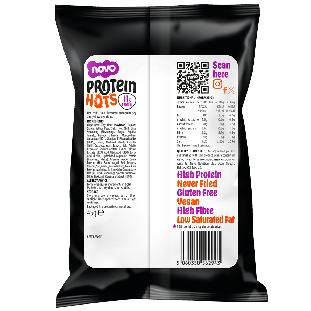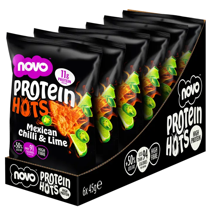 Novo Mexican Chilli & Lime Protein Hots are a bold and spicy protein chip, that combines a hot kick of chilli, with the zing of lime, for a taste that delivers a kick every time. They are deeply satisfying, but never deep fried. Theyre a great tasting high protein pop chip, with 11g of protein per bag, making them a great way to add more protein to your diet, for healthier snackers. Crispy, satisfying and simply delicious.