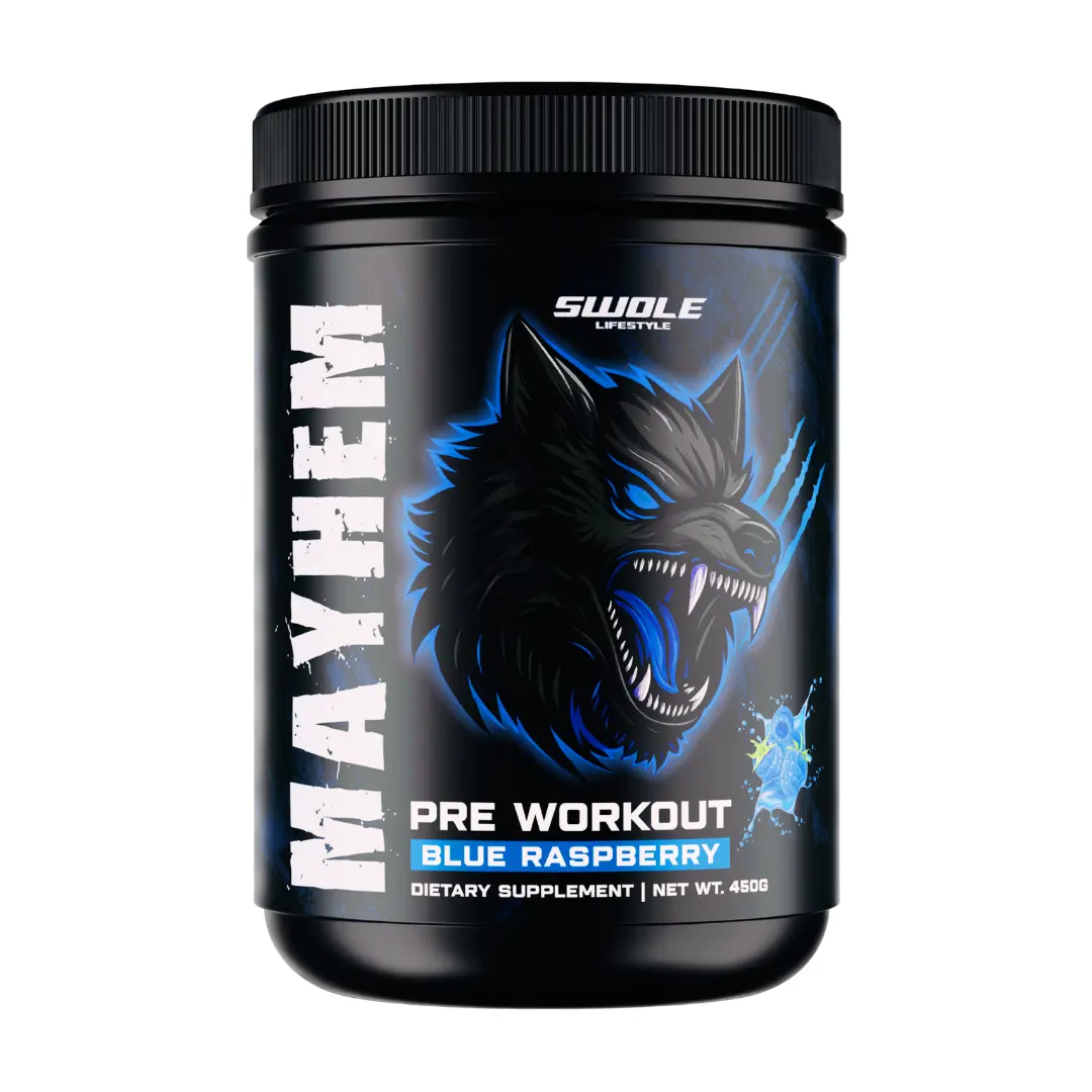 SWOLE MAYHEM is an advanced level pre workout delivering a powerful Pump matrix with 6g Citrulline Malate, 2.5g Betaine Anhydrous, and 500mg Taurinefor enhanced blood flow and endurance. A high-energy blend delivers 350mg Caffeine and 250mg Juniper Berry Extract per scoop to keep intensity high from start to finish.