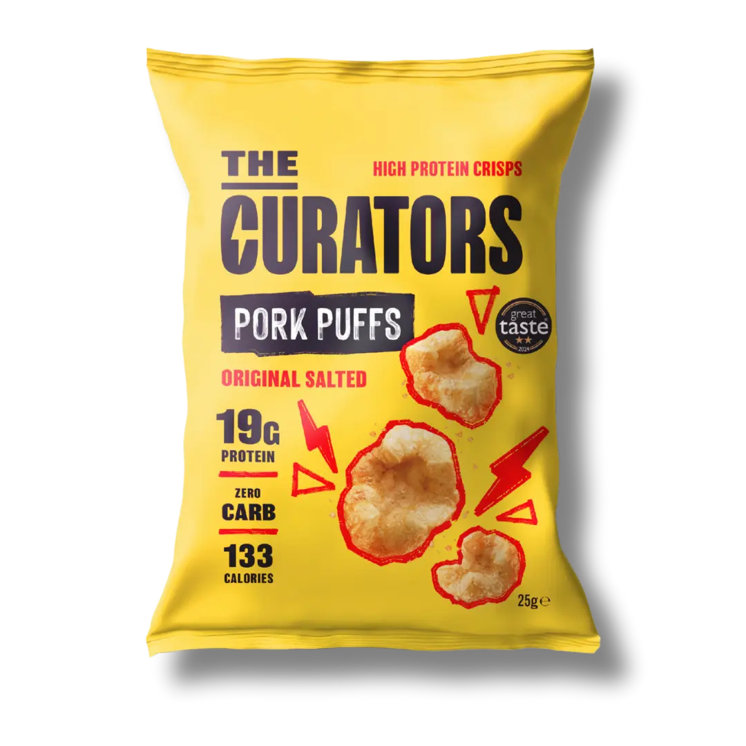 Gluten free, hand cooked and containing a whopping 18g of protein per bag. Inspired by Latin street-food snacks Chicharrones , The Curators Cheese Pork puffs are made from the finest pork rind, hot flashed for a light and crunchy texture and packed full of natural protein.