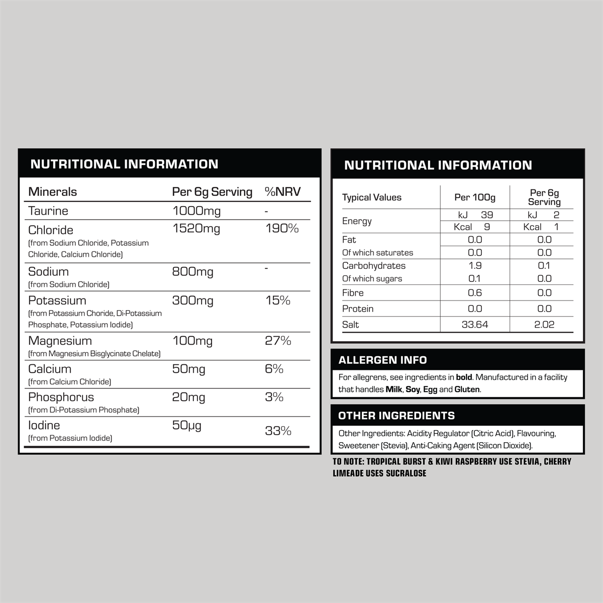 HYDRATE delivers 2,790mg+ of electrolytes in a sweat-matched ratio for optimal performance, hydration, and recovery. With 1,000mg Taurine and highly bioavailable minerals, it goes beyond basic rehydration - enhancing fluid absorption, muscle function, and energy metabolism at the cellular level.Zero sugar, zero calories, and naturally flavoured, HYDRATE is designed for those who sweat - not for those who sit. Whether you're mid-workout, in between sets, or on your feet all day, HYDRATE fuels performance where water alone falls short.Expect a lightly salty finish - real hydration isnt candy-sweet, its science-backed.Please note: Kiwi Raspberry & Tropical Burst use Stevia, whereas Cherry Limeade uses Sucralose