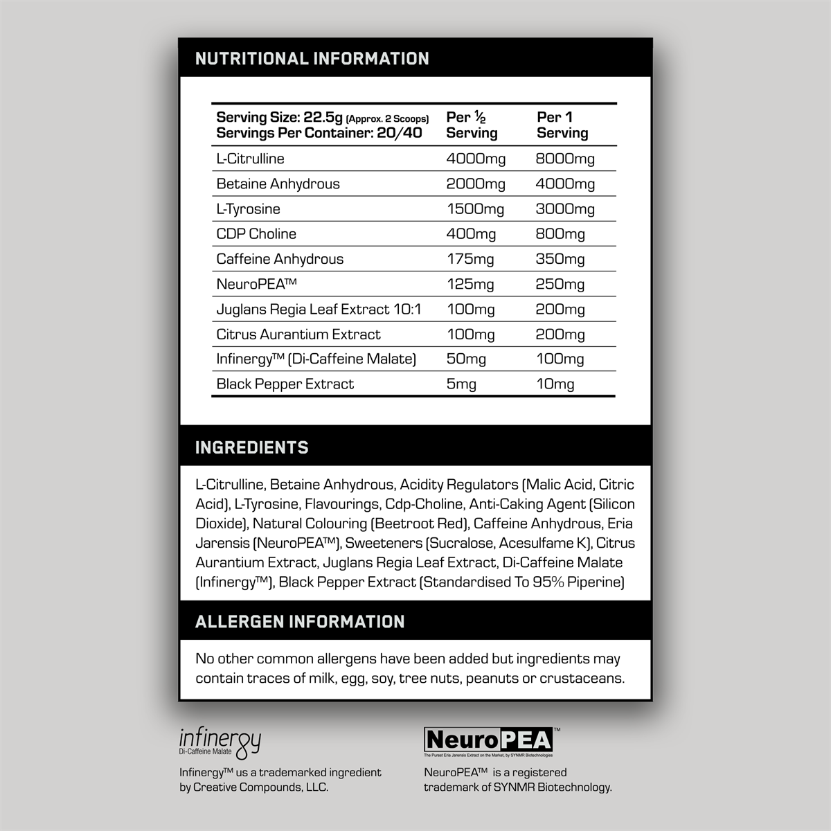 NOVA is our highest stimulant pre-workout built for unrelenting drive, tunnel-vision focus, and explosive performance. 12,000mg of pump and cell-volume support - 8,000mg L-Citrulline + 4,000mg Betaine Anhydrous - drives blood flow, oxygen delivery, and muscular fullness.A neuro-forward focus stack pairs 3,000mg L-Tyrosine with 800mg CDP Choline to elevate dopaminergic and cholinergic pathways for laser focus, resilience under fatigue, and crisp mind-muscle connection. Mood and intensity are amplified to euphoric levels with NeuroPEA (200mg) and Juglans Regia extract (200mg).Energy is delivered through a dual-phase stimulant system 350mg Caffeine Anhydrous for rapid onset plus 100mg Di-Caffeine Malate for a smoother tail - helping maintain session-long output without the severe comedown. Citrus aurantium (200mg) adds clean thermogenesis and metabolic drive, while Black Pepper Extract (10mg) supports bioavailability across the stack.This isnt a casual pick-me-up. NOVA is engineered for days you want supraphysiological output - PR attempts, long grinders, and sessions where every set needs intent. Expect hard-charging energy, locked-in focus, and pumps that keep pace with the intensity.WARNING: This product contains Eria Jarensis, a banned ingredient within drug tested sports such as the IPF. If you are a tested athlete, purchase at your own risk. We do not recommend you using this pre workout.