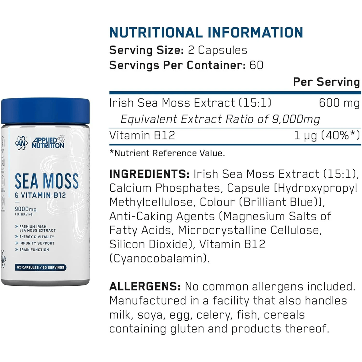 Irish Sea Moss has been a trending ingredient amongst the health conscious, and those looking to maximise the associated health benefits of digestive, thyroid, heart, and immune health. Sea Moss contains a high natural mineral content, fibre, and other naturally occurring compounds like iodine, magnesium, potassium, and vitamins A, C, and K. The carrageenan supports gut health by acting as a prebiotic fibre, while omega-3 fatty acids contribute to heart health and managing cholesterol levels. With added Vitamin B12 for EFSA claim: Vitamin B12 contributes to the normal function of the immune system.