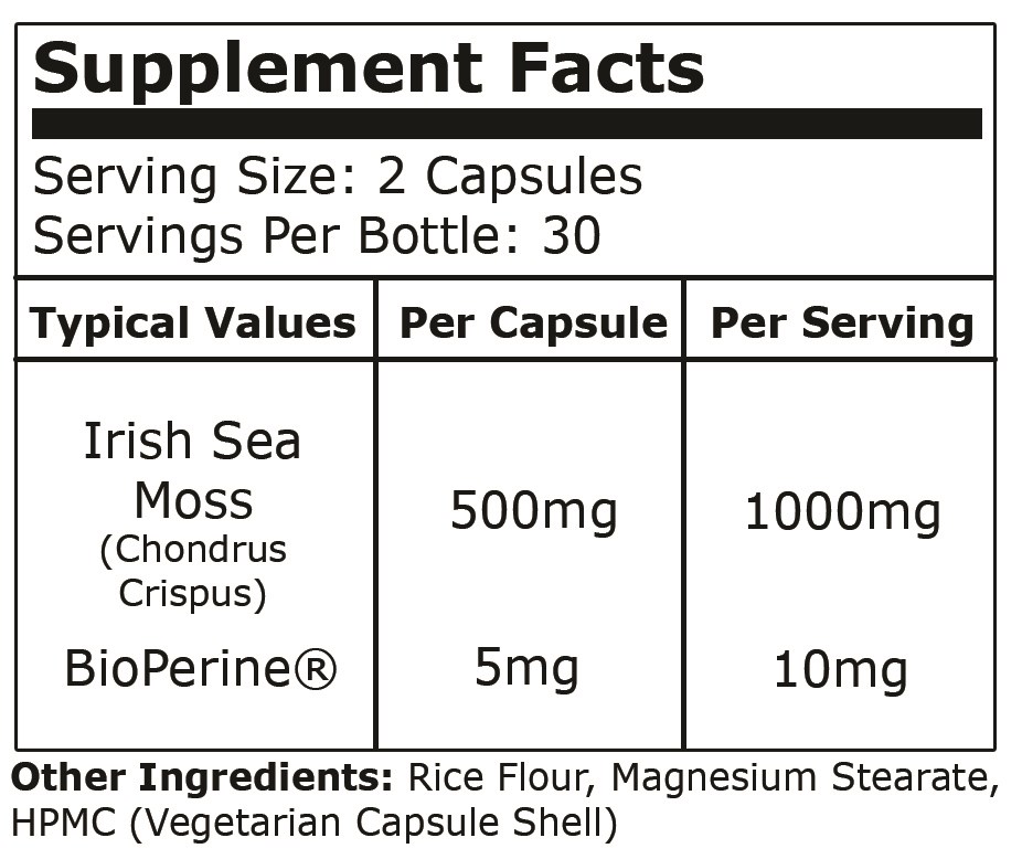 Irish Sea Moss - Daily Wellness SupportFeel Balanced. Feel Energised. Feel You.?Modern life has a way of taking its toll, long days, tough training sessions, and the constant grind can leave you running low. Thats where Irish Sea Moss steps in.This natural powerhouse has been used for generations as a nutrient-rich superfood. Packed into easy-to-take capsules, Irish Sea Moss gives you straightforward support for daily wellness helping you stay on top of your routine, both in and out of the gym.What Can Irish Sea Moss Do for You?Support your everyday energy and vitality.Help keep you feeling your best, no matter the demands of your day.Provide plant-based, vegan-friendly nutritional support.Make it easy to add a traditional wellness staple to your modern routine.Why Choose Black Mamba Irish Sea Moss??Not all sea moss supplements are the same. Our formula is fortified withBioPerine, a patented black pepper extract that helps your body absorb nutrients more efficiently. That means you get maximum benefit out of every serving.How to Use?Take 2 capsules daily with food. Simple, convenient, and effective support you can count on.Dont just get through the day stay balanced, stay sharp, and feel your best with Irish Sea Moss.